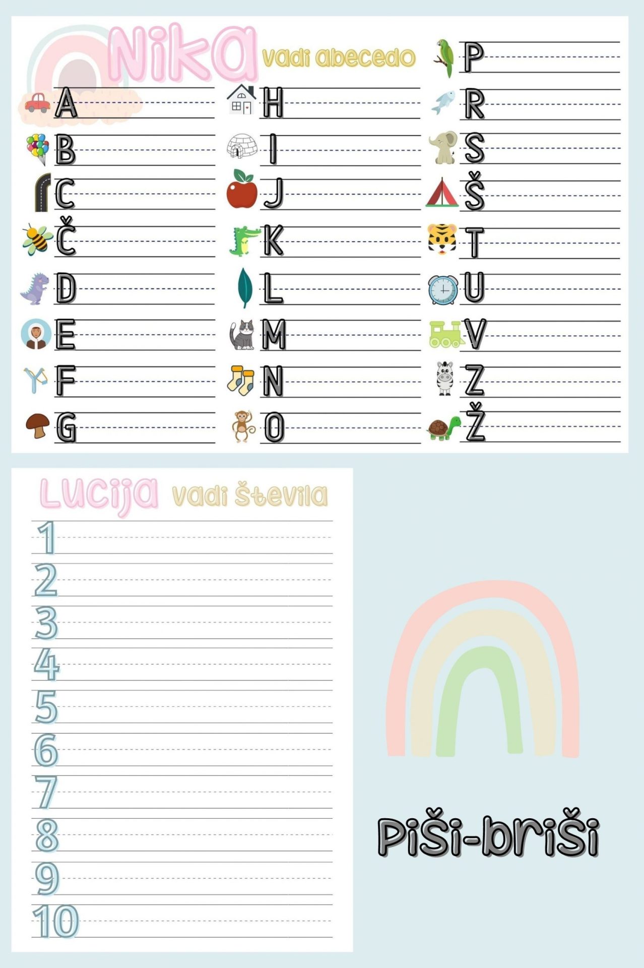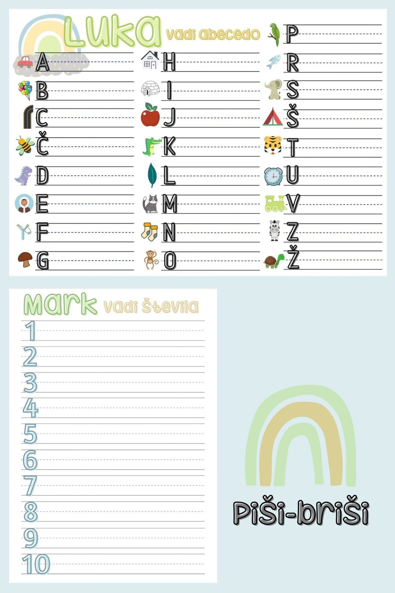 Komplet piši briši abecede in števil z otrokovim imenom je odlična zabava za naše najmlajše. S pisanjem bodo urili grafomotorične spretnosti in se ob enem tudi zabavali.